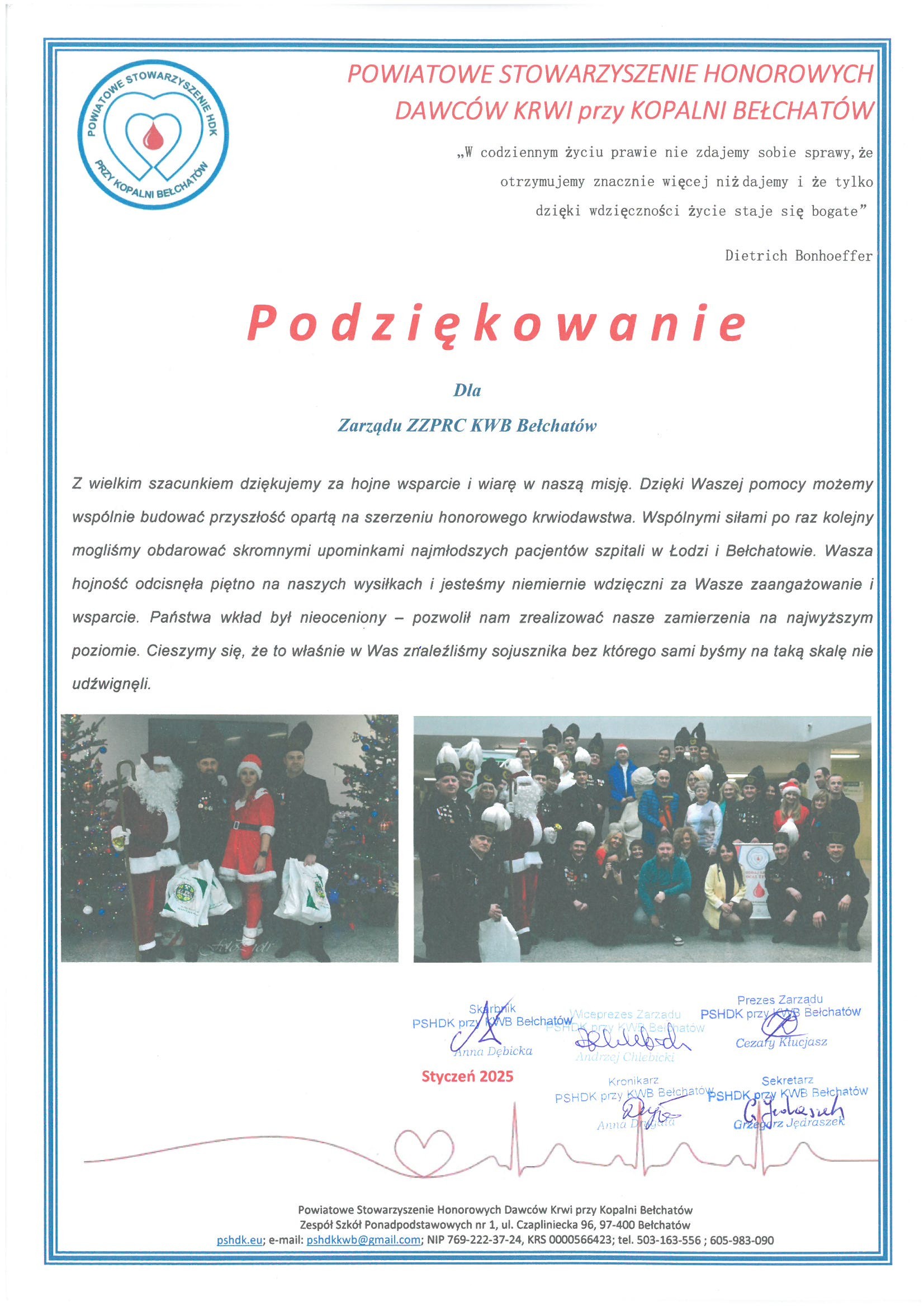 Podziękowanie dla Zarządu ZZPRC KWB Bełchatów