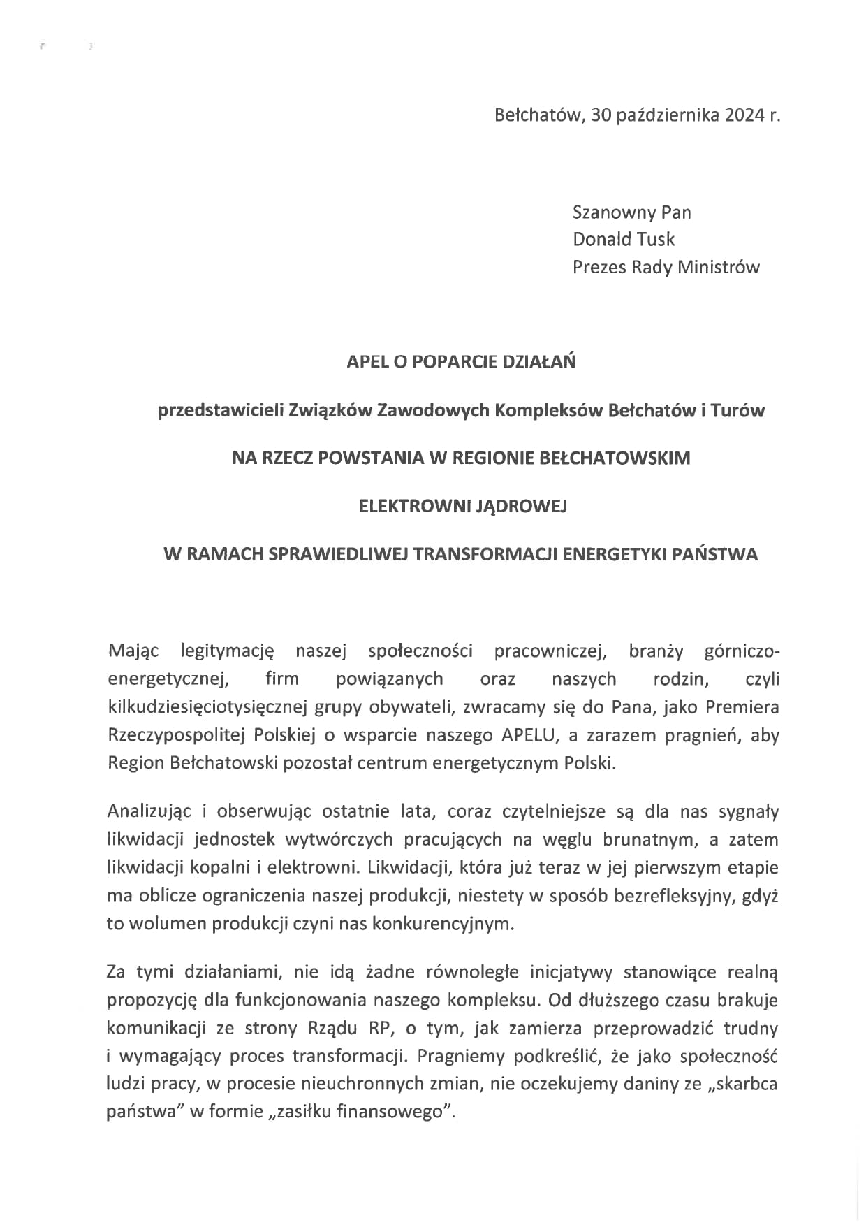 Jak wspomniał na spotkaniu Przewodniczący ZZPRC KWB Bełchatów kol. Adam Blada - "już 30 października 2024 roku blisko 30 organizacji związkowych z kopalni i elektrowni w Bełchatowie i Turowie zaapelowało do Premiera Donalda Tuska o działania na rzecz powstania w regionie bełchatowskim elektrowni jądrowej".