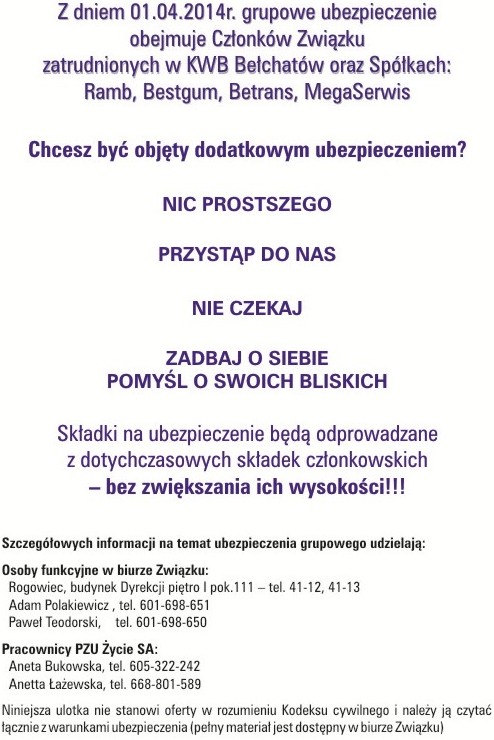 XXV Walne Zebranie Delegatów ZZPRC KWB Bełchatów zaakceptowało wprowadzenie od kwietnia 2014r. dodatkowego Grupowego ubezpieczenia w PZU Życie SA dla Członków ZZPRC KWB Bełchatów. Polisa obejmuje wiele aspektów życia codziennego i zapewnia wsparcie finansowe w wypadku określonych zdarzeń losowych. Ubezpieczenie podnosi ekonomiczną atrakcyjność dla Członków Związku, jak i ofertę dla tych pracowników, którzy będą chcieli do Nas przystąpić.