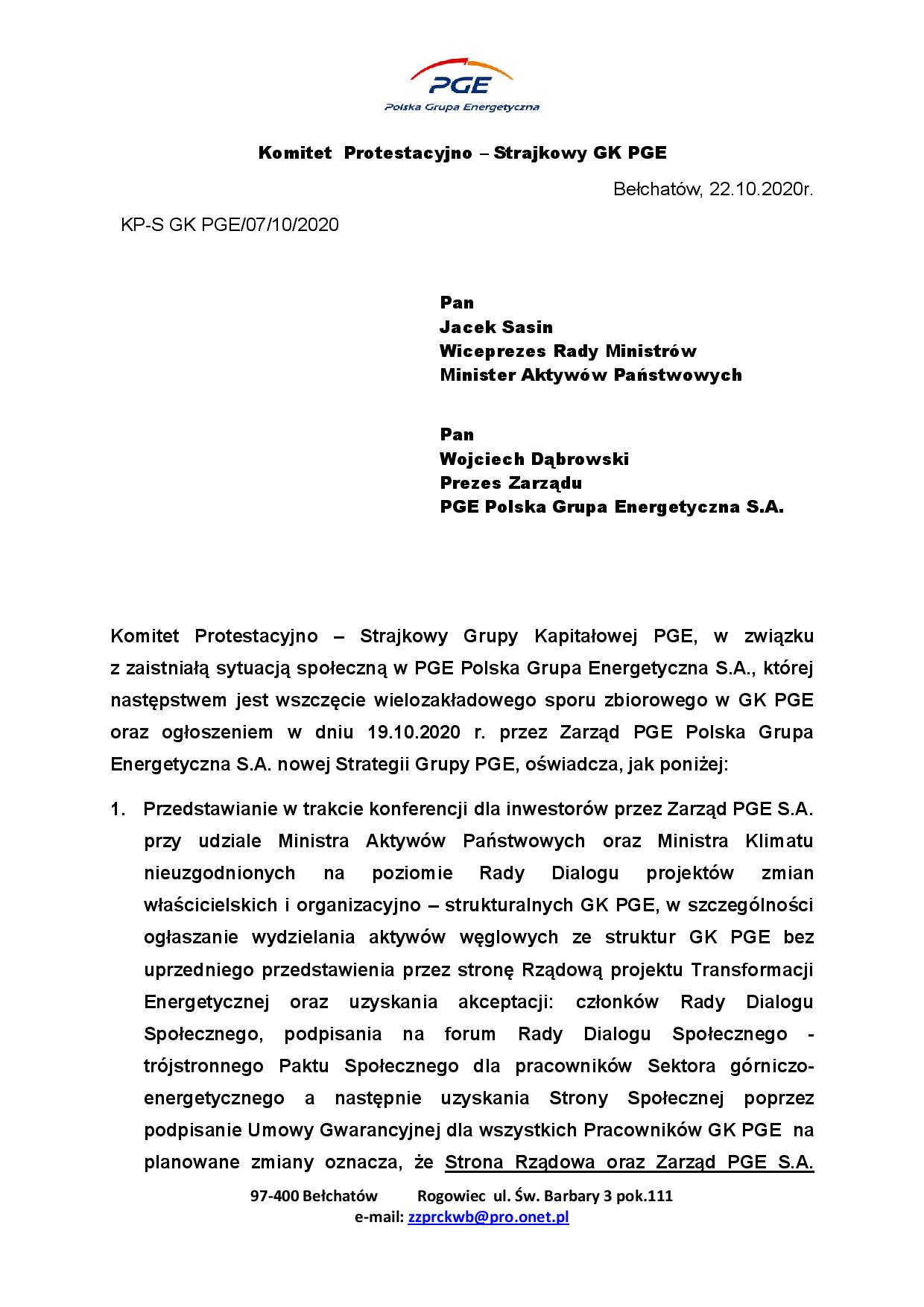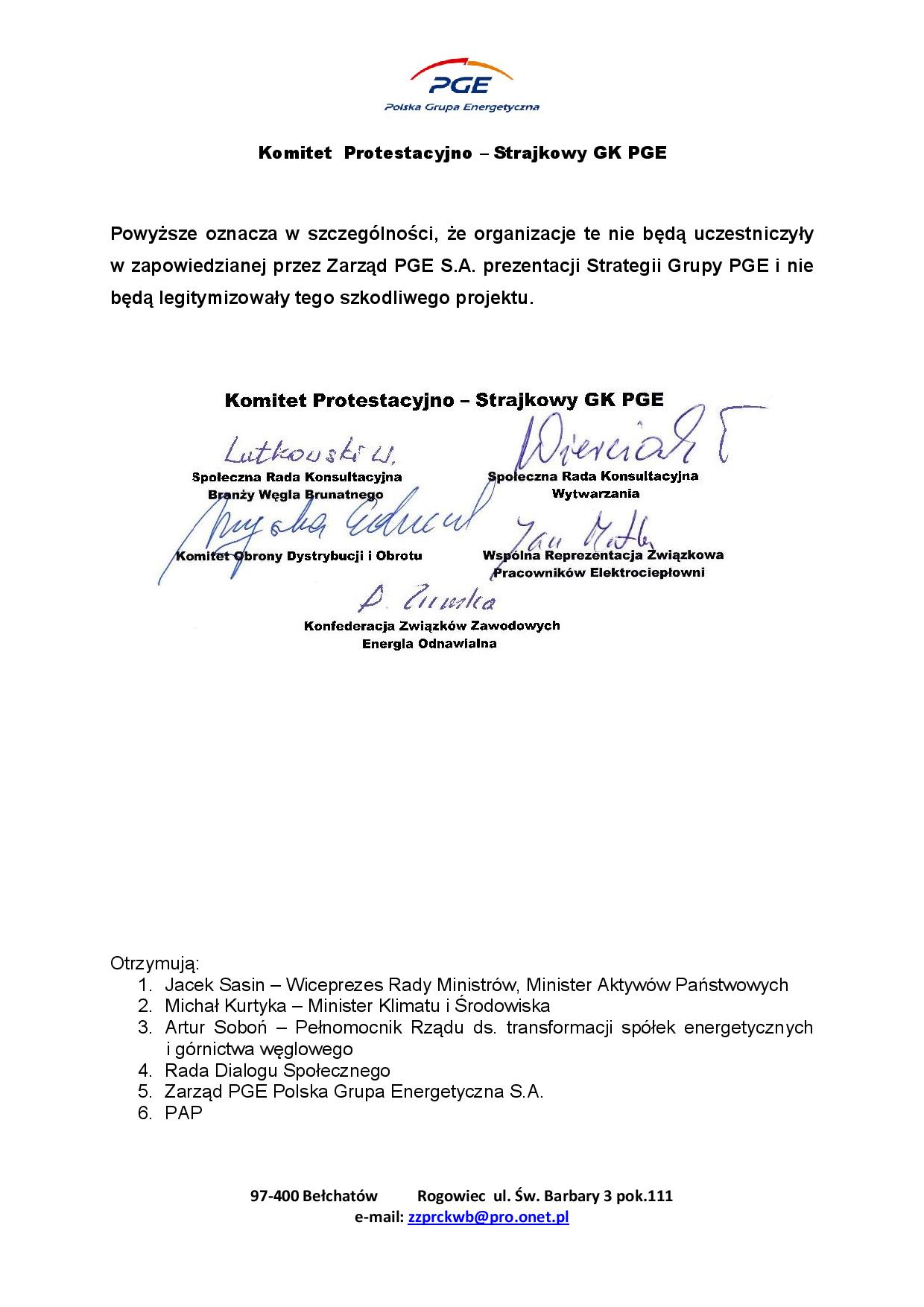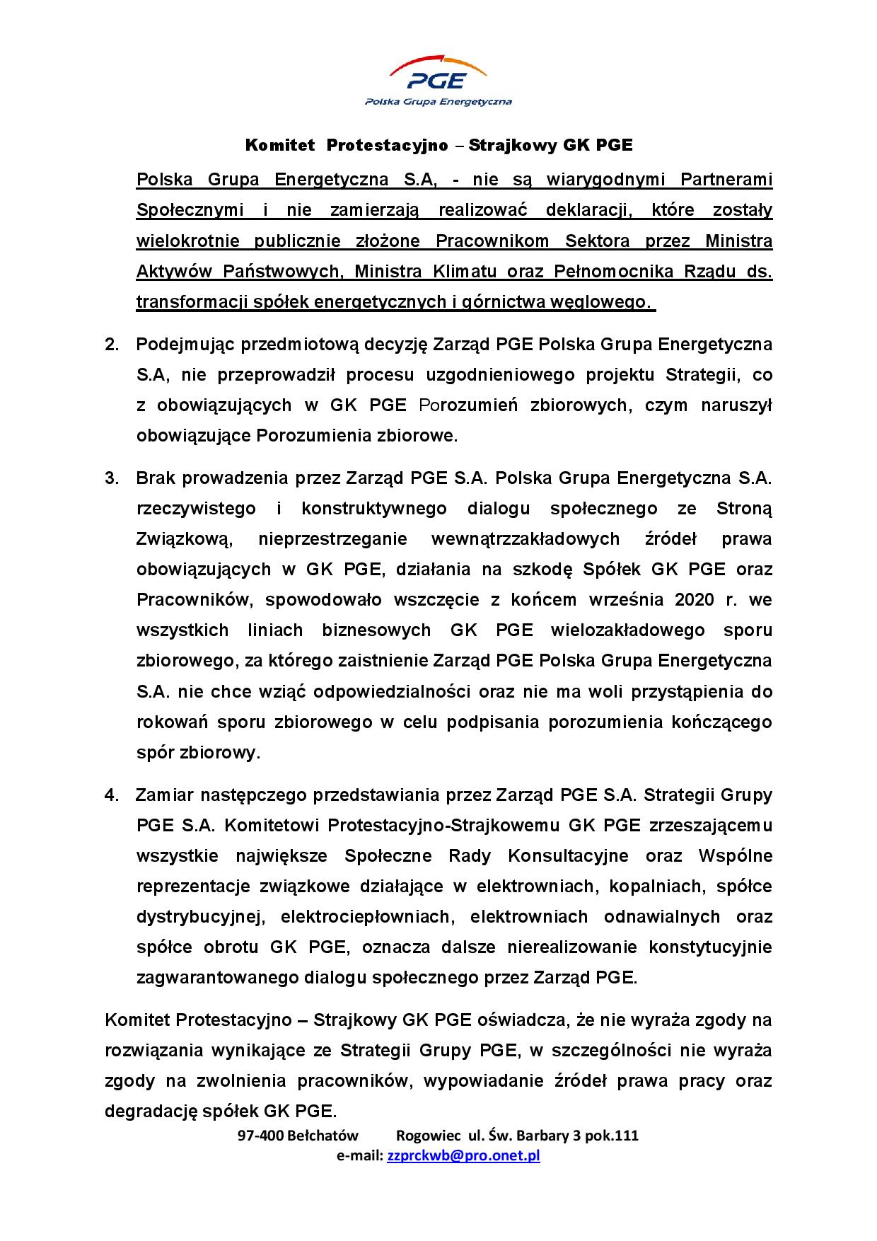 STANOWISKO Komitetu Protestacyjno-Strajkowego GK PGE